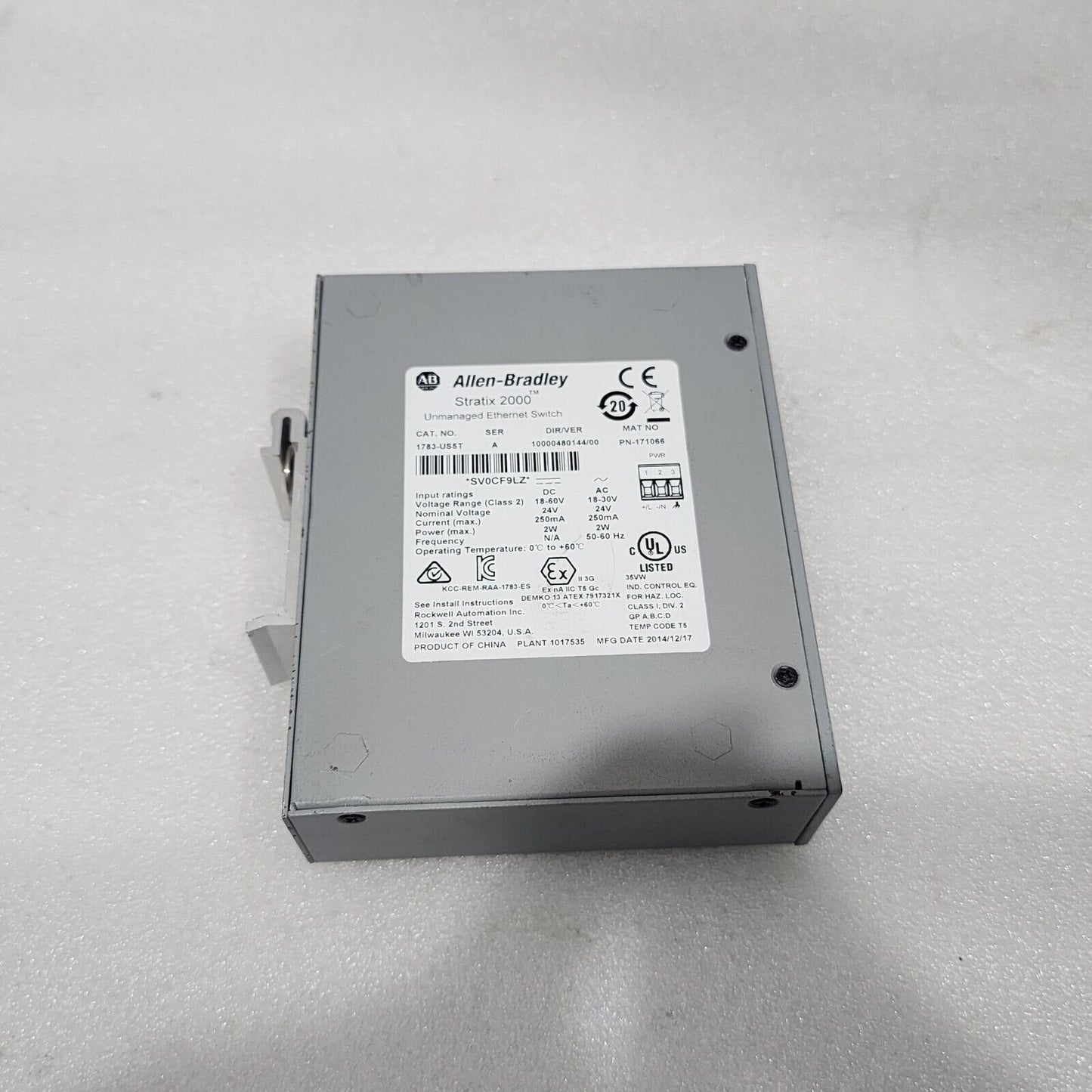 Product Detail:ALLEN BRADLEY STRATIX 2000 CAT 1783-US5T UNMANAGED ETHERNET SWITCHMODEL: STRATIX 2000CAT NO: 1783-US5TSERIES: ATYPE: UNMANAGED ETHERNET SWITCHDIR/VER: 10000480144/00