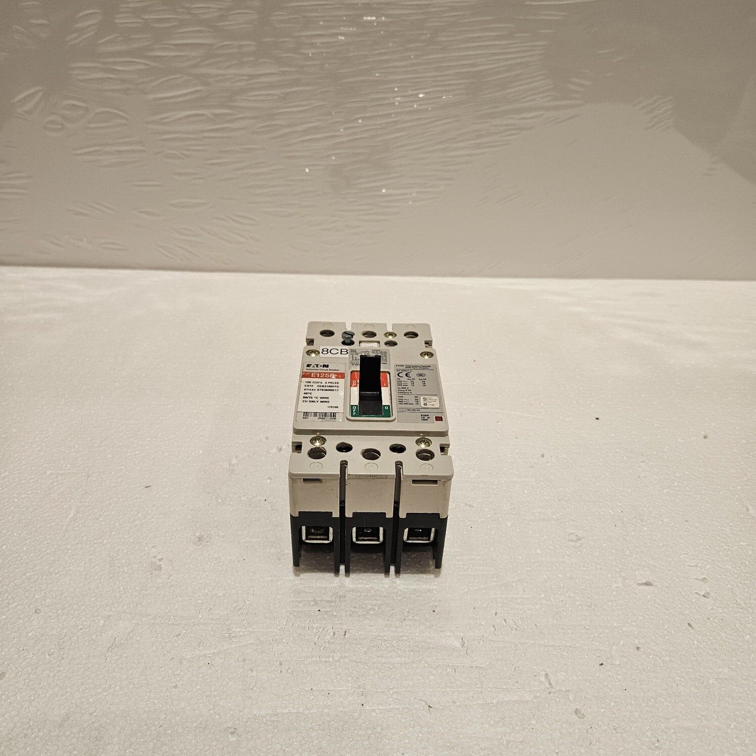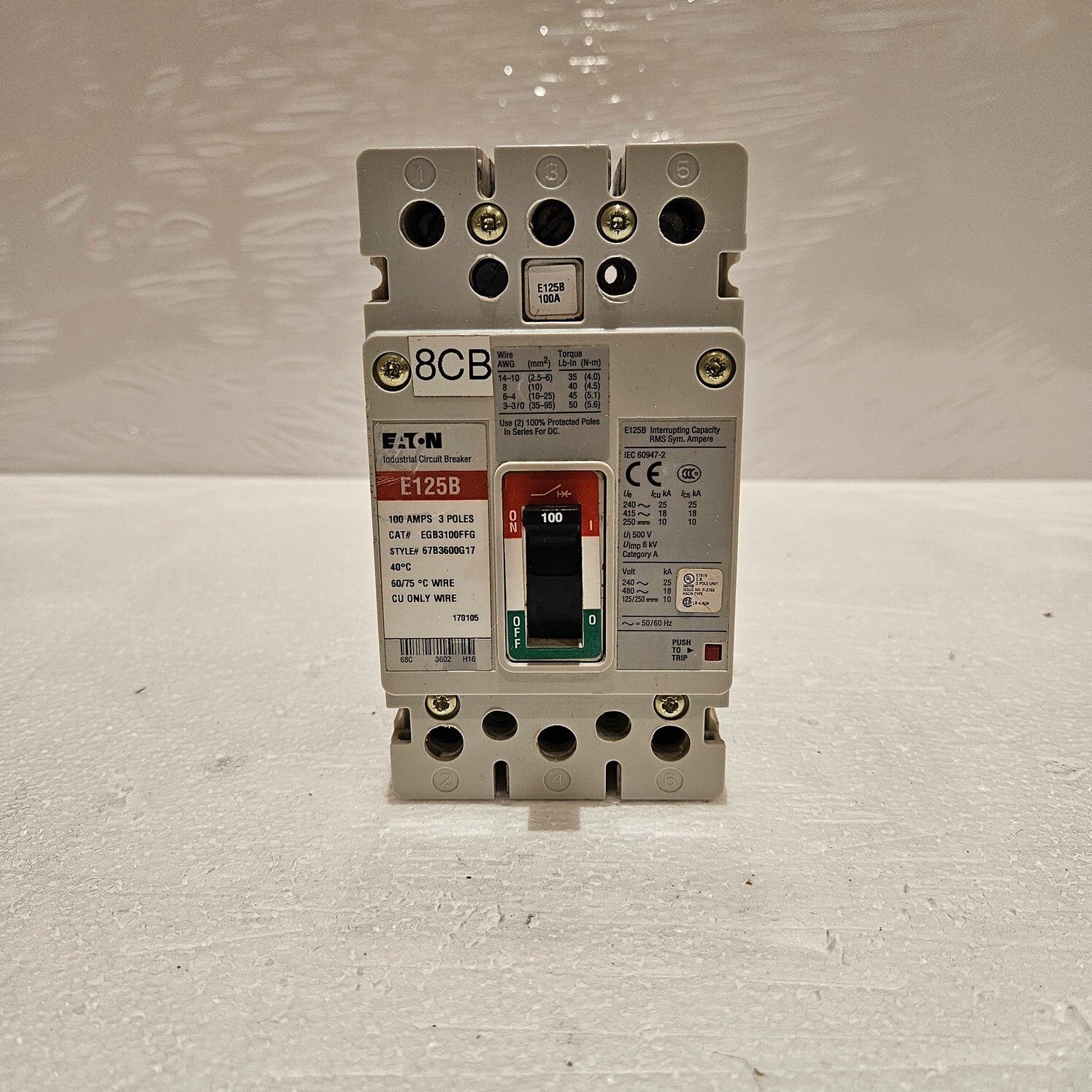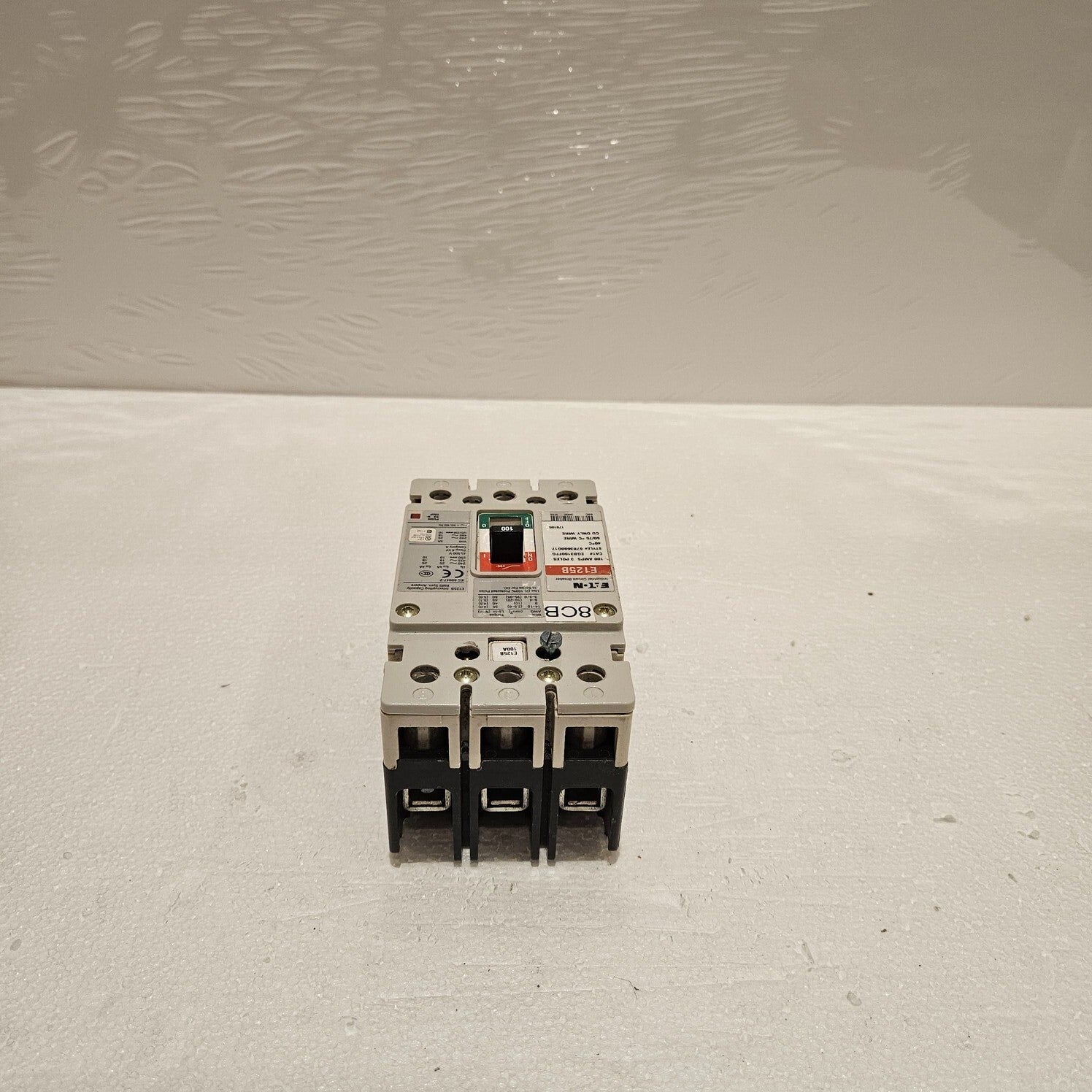 EATON EGB3100FFG 3-POLE CIRCUIT BREAKER 100AMODEL: E125BCAT NO: EGB3100FFGSTYLE: 67B3600G17TYPE: 3-POLE CIRCUIT BREAKER 100A