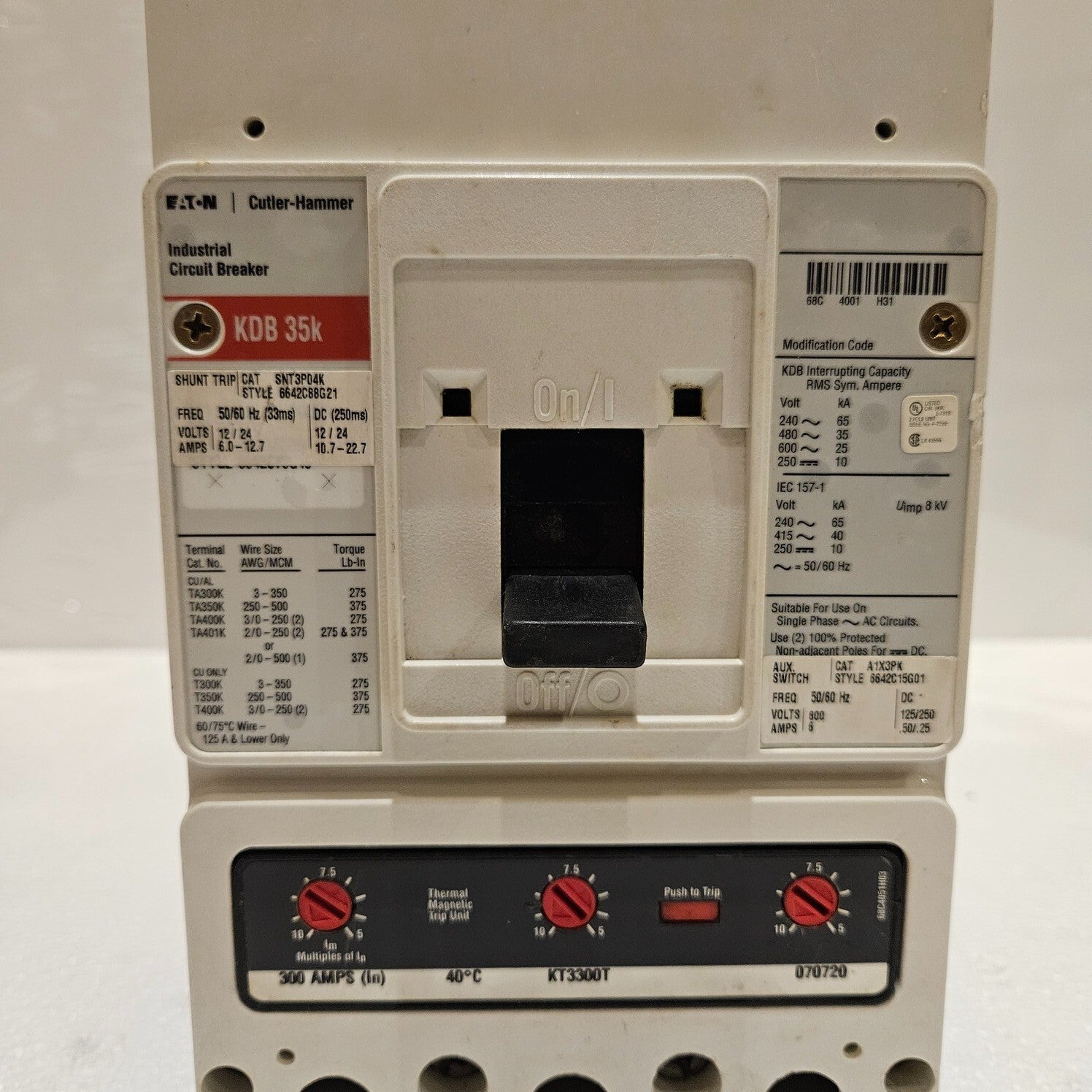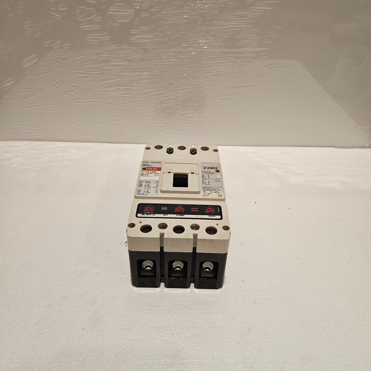EATON KDB3300W 3-POLE CIRCUIT BREAKER 300A TRIP UNIT KT3300TMODEL: KDB 35KCAT NO: KDB3300WTYPE: 3-POLE CIRCUIT BREAKER 300ATRIP UNIT: KT3300T